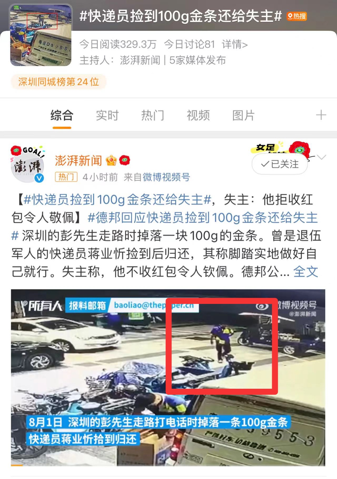近日,媒体报说念了一个#快递员捡到100g金条还给失主#的故事,登上微博热搜,得到了网友的吟唱:“真门不夜关”“为这个快递员点个赞”! 皇冠hg86a8月1日,失主彭先生、自媒体博主“笑三西”在酬酢平台上共享了我方“珠还合浦”的进程。 本日地午,广东深圳泰好意思珠宝园内,彭先生刚从金库提真金不怕火了5个100g的金条,复返途中莫得相识到金条外包装破裂,导致其中一个100g的金条失慎遗漏。 运道的是,深圳罗湖区水贝外洋珠宝交游中心机分裂部的德邦快递员蒋业忻不测中捡到了金条,独立即报警。在警方的匡助下,蒋业忻实时与彭先生得回关联,告成将金条璧还。 澳门体育彩票中心地址亚新轮盘